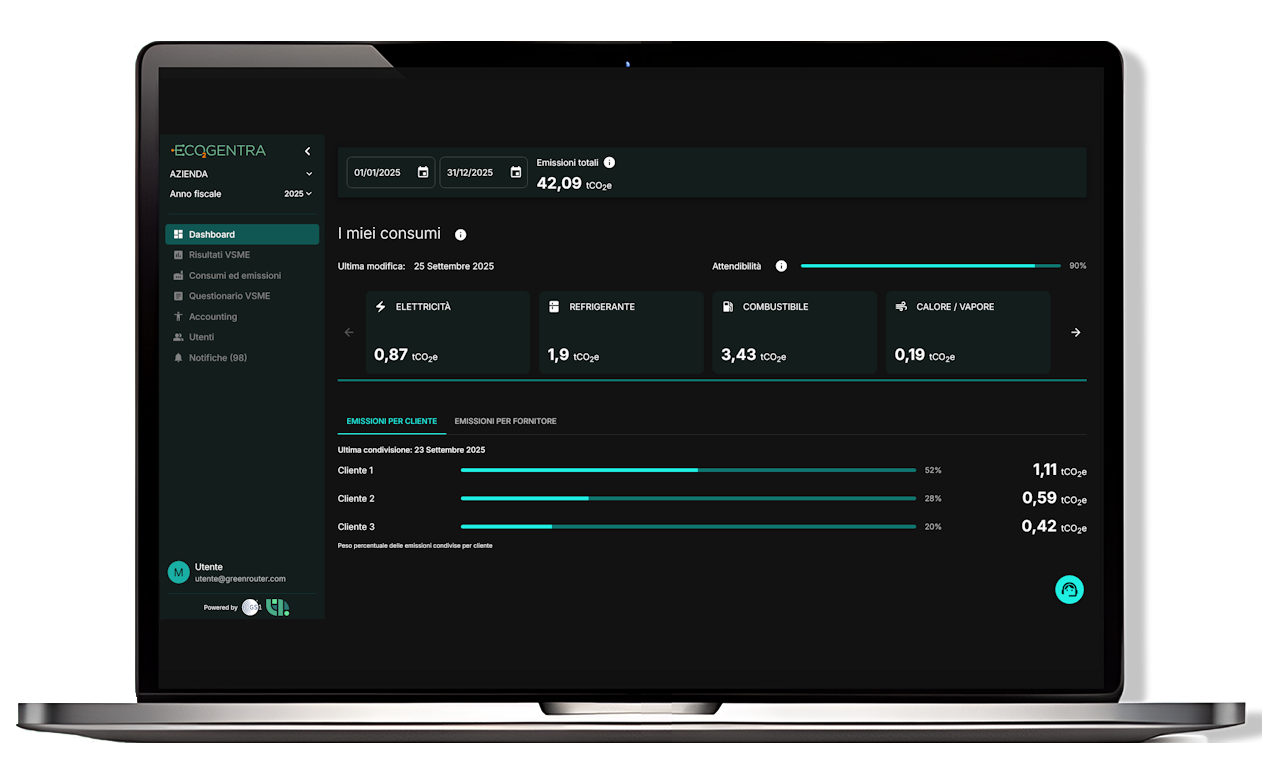 - Qualità e affidabilità dei dati, con un sistema di calcolo delle emissioni di CO2e conforme a standard internazionali (GHG Protocol, ISO 14064-1, GLEC 3.1)